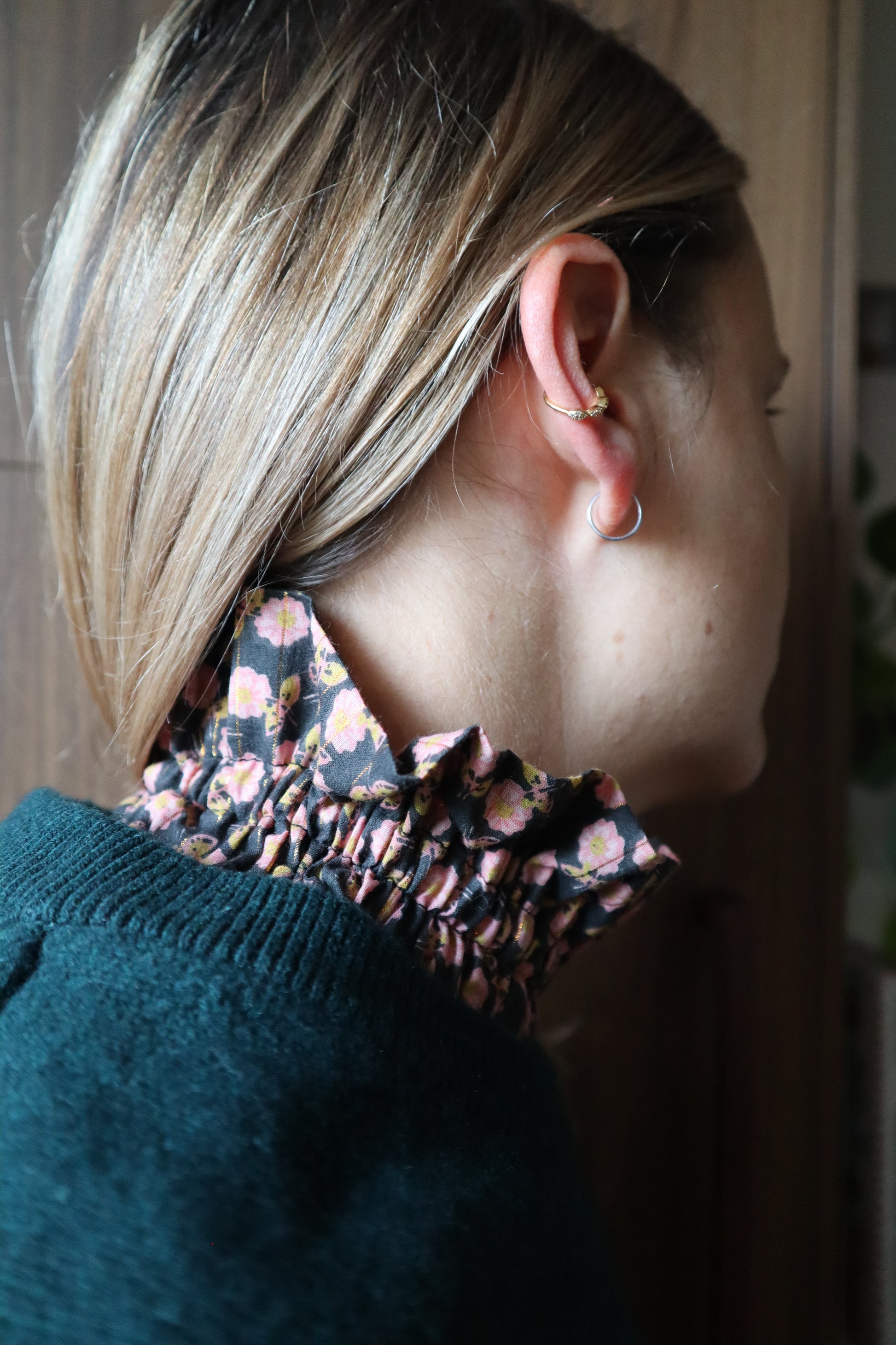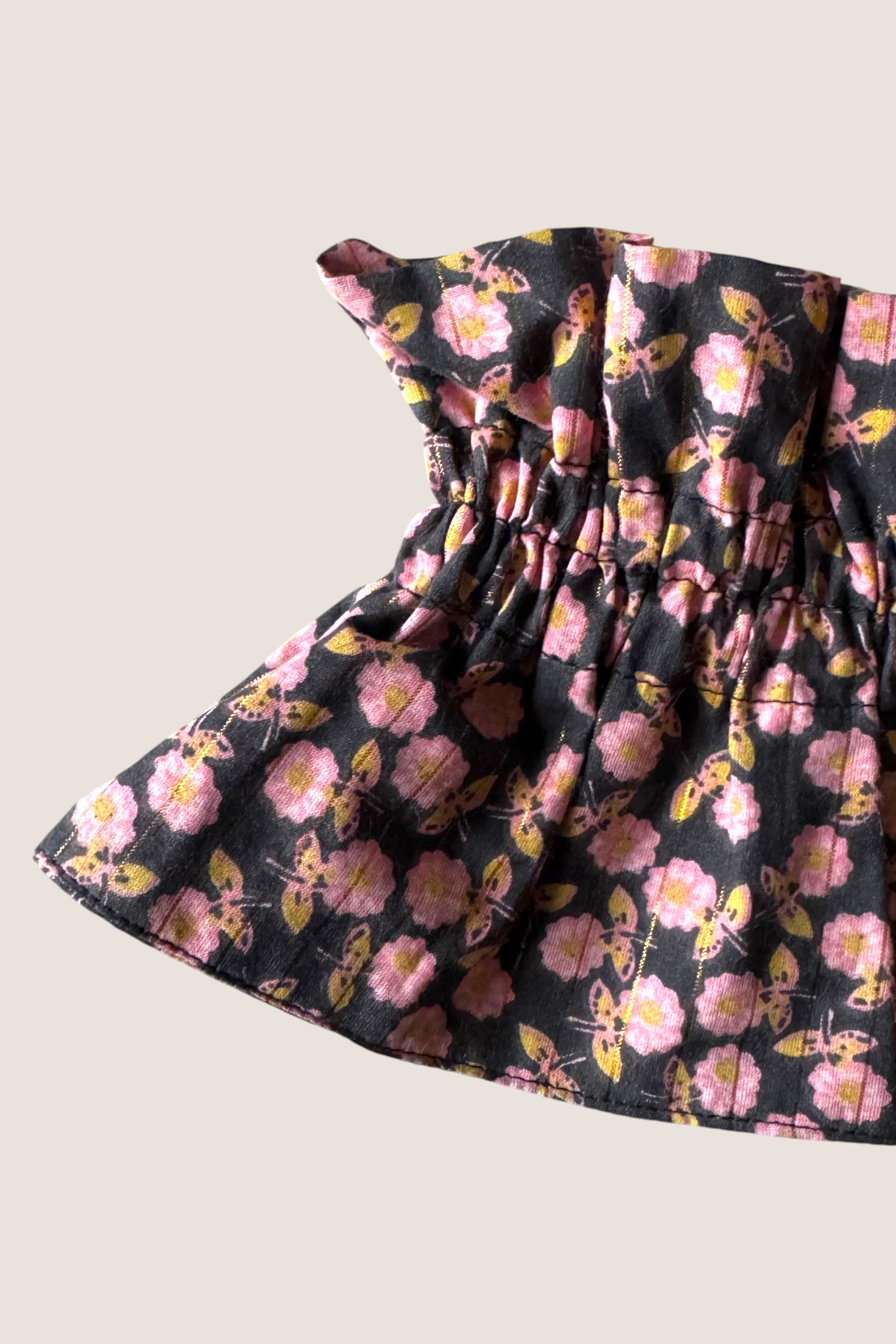 Apportez une touche chaleureuse et originale à vos tenues avec notre col amovible à petites fleurs roses et lurex doré, confectionné à partir de nos chutes de tissus. Une manière élégante de sublimer votre look…