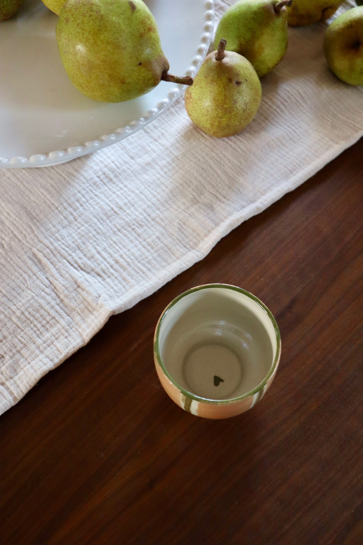 Chaque tasse offre une prise en main réconfortante et dévoile un détail plein de tendresse : un petit cœur peint à l’intérieur — rose ou vert, selon l’inspiration du moment. Parfait pour un café du matin ou un thé entre copines.