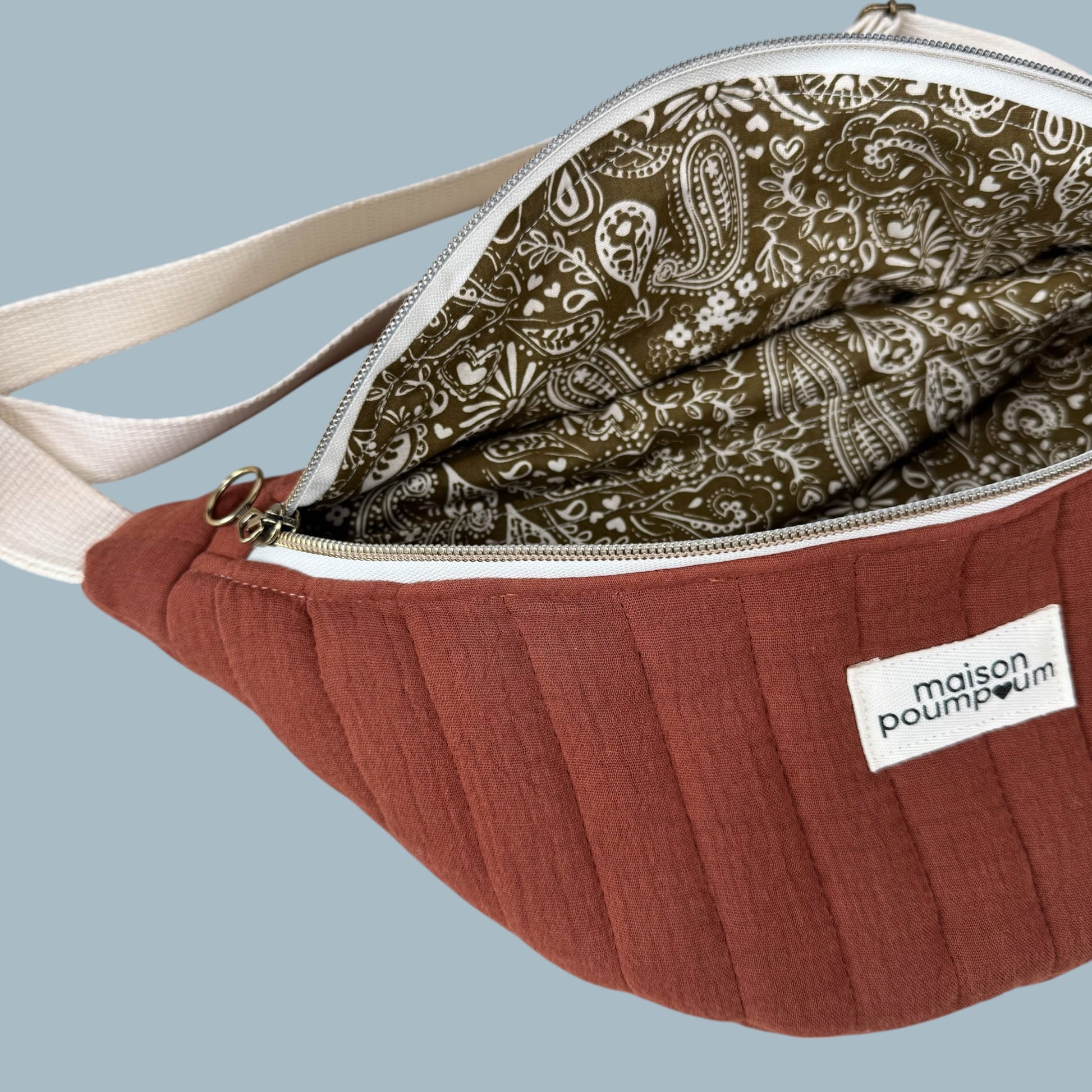 Avec son tissu en double gaze de coton matelassée dans un ton un rouille doux et profond, cette banane coche toutes les cases : ultra confortable, facile à porter et carrément désirable.
