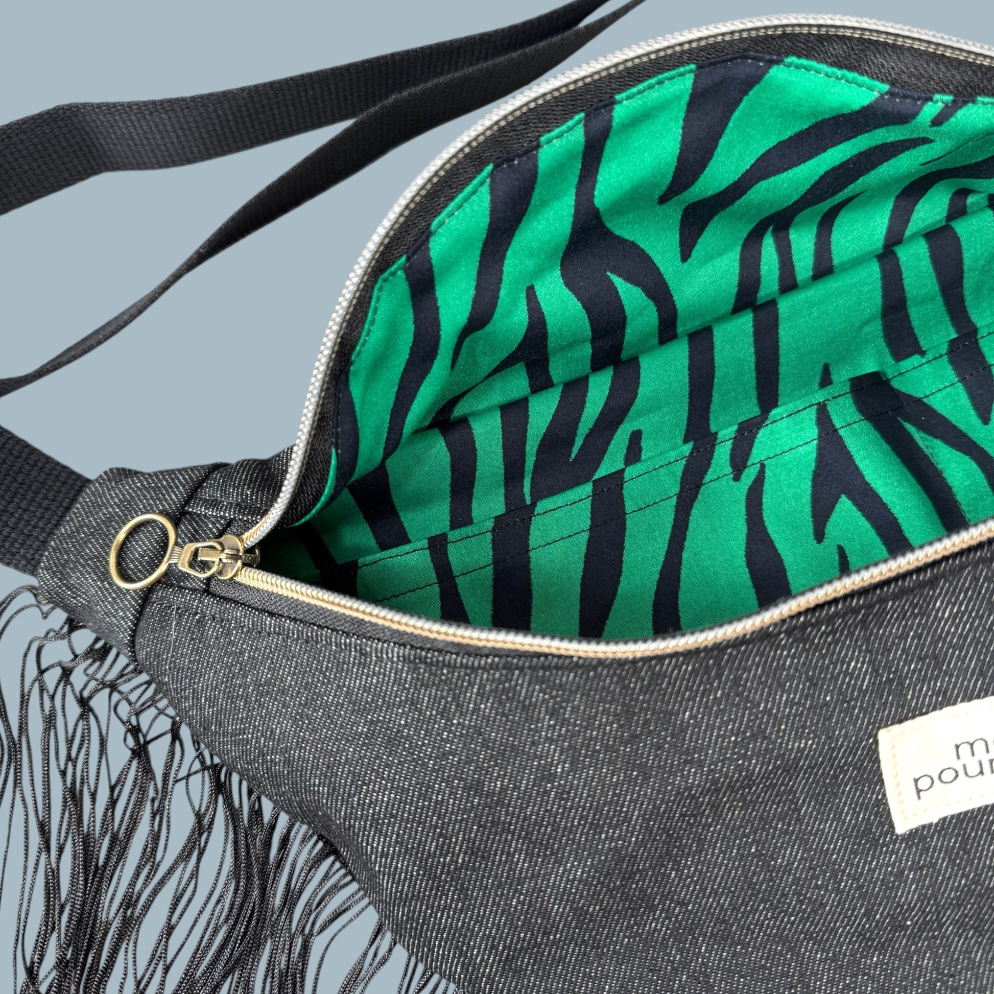 Cette banane en jean noir est twistée par une frange en ton sur ton, qui lui apporte un vrai supplément d’âme. Pratique et cool, c’est la pièce qui ajoute du mouvement à votre look — sans jamais compromettre le confort.