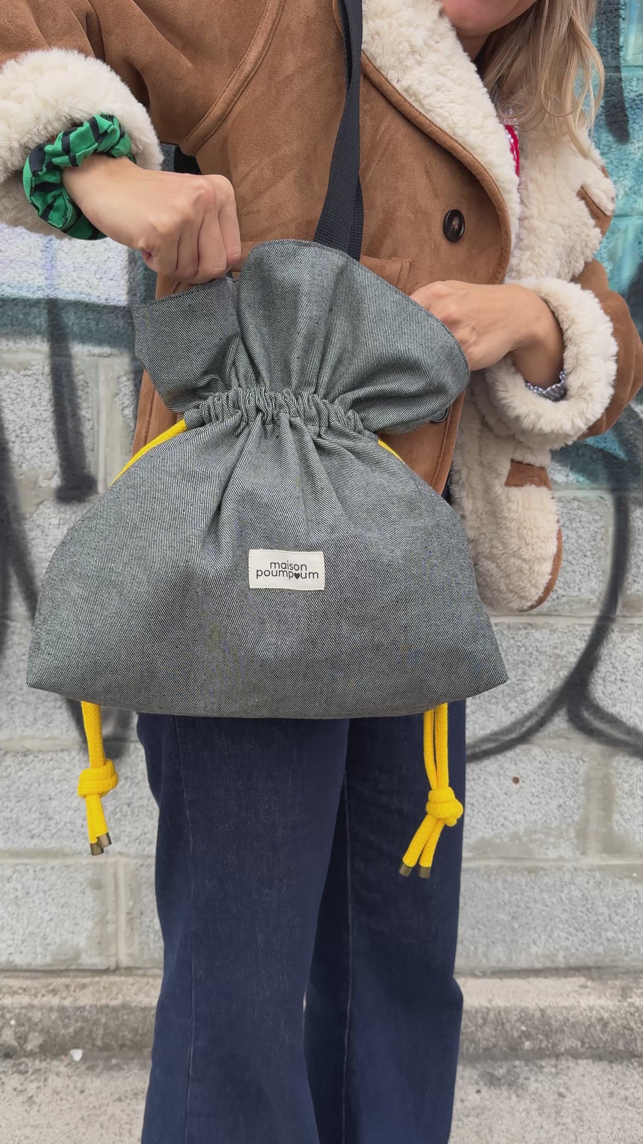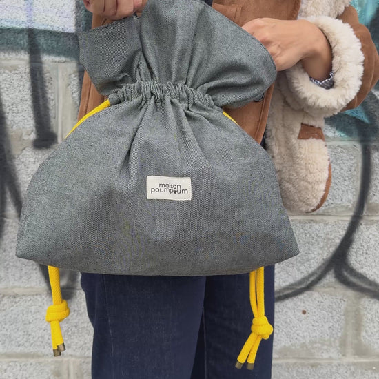 Le sac bourse en jean gris Maison Poumpoum, c’est le parfait équilibre entre style décontracté et détails raffinés.