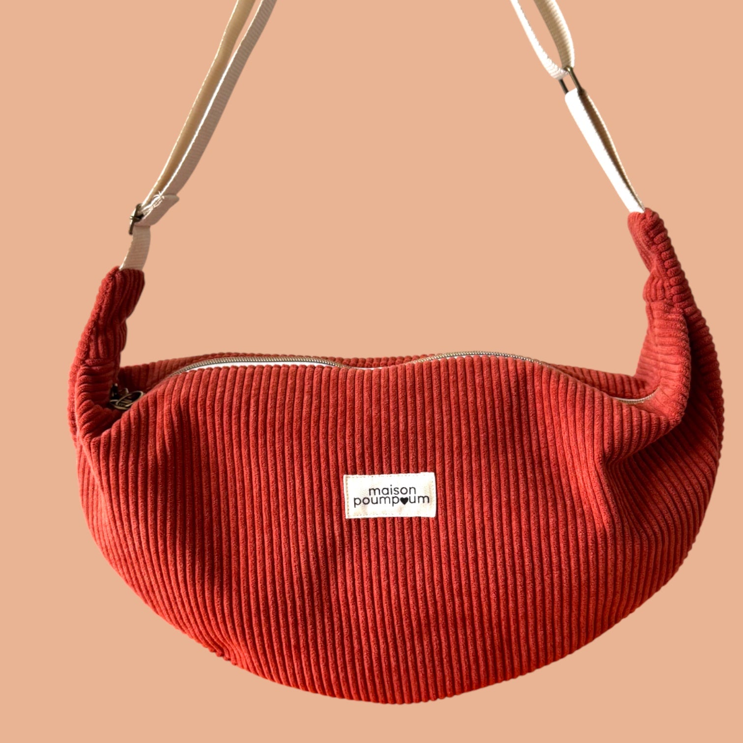 Le sac demi-lune en velours terracotta est le nouvel indispensable de la saison. Avec sa forme arrondie et son volume généreux, il combine style et praticité. On adore son velours côtelé terracotta, chaleureux et tendance, associé à une doublure imprimée léopard pleine de caractère.