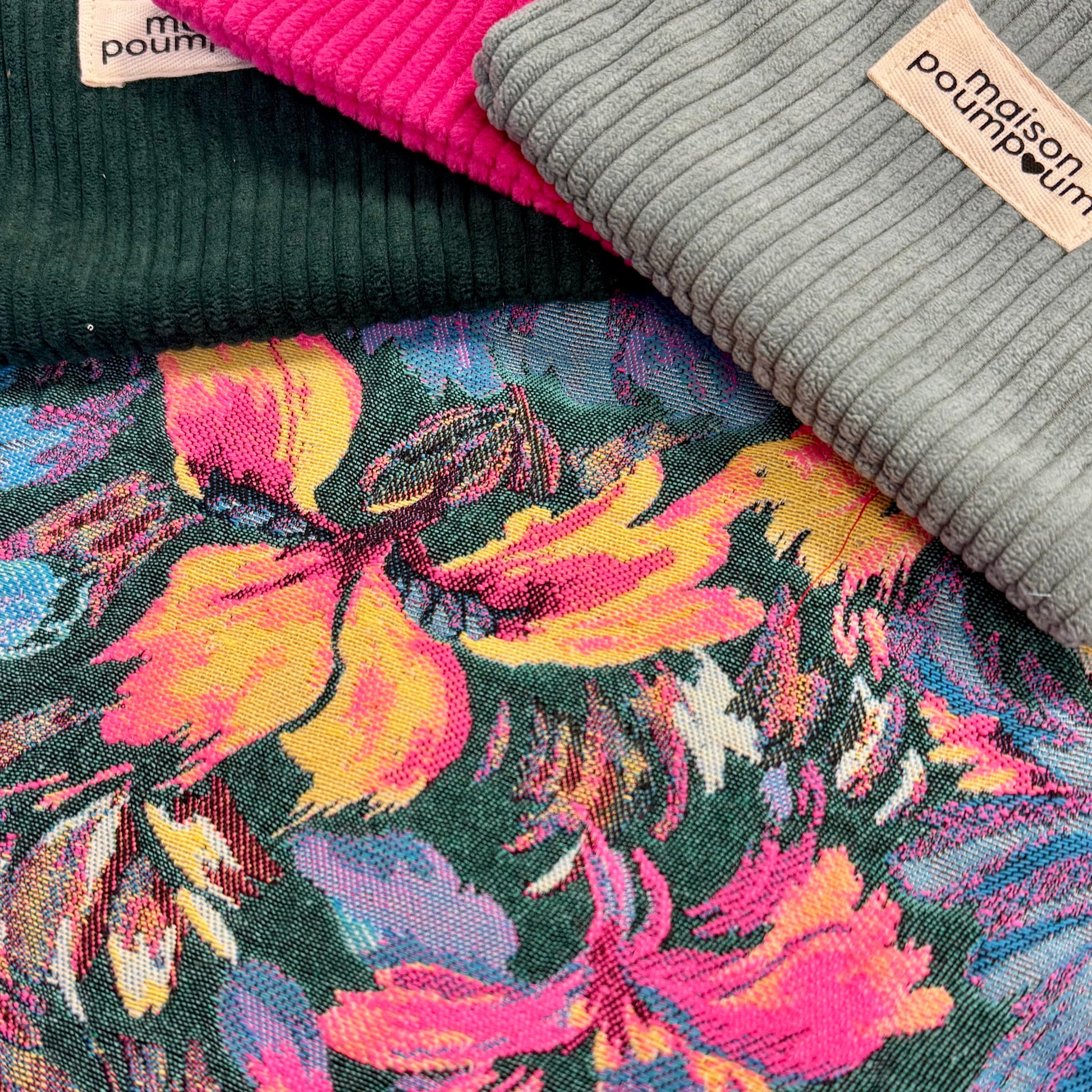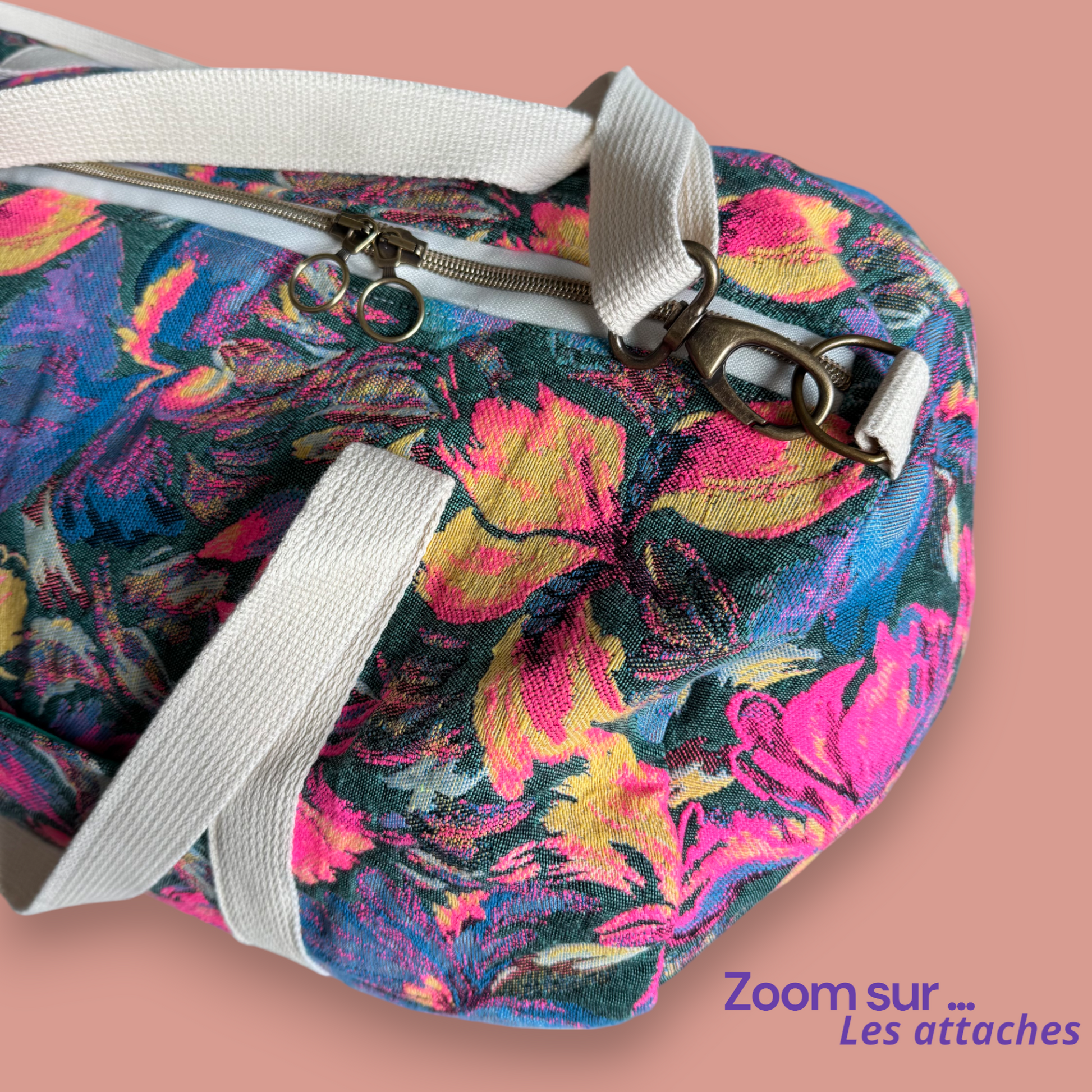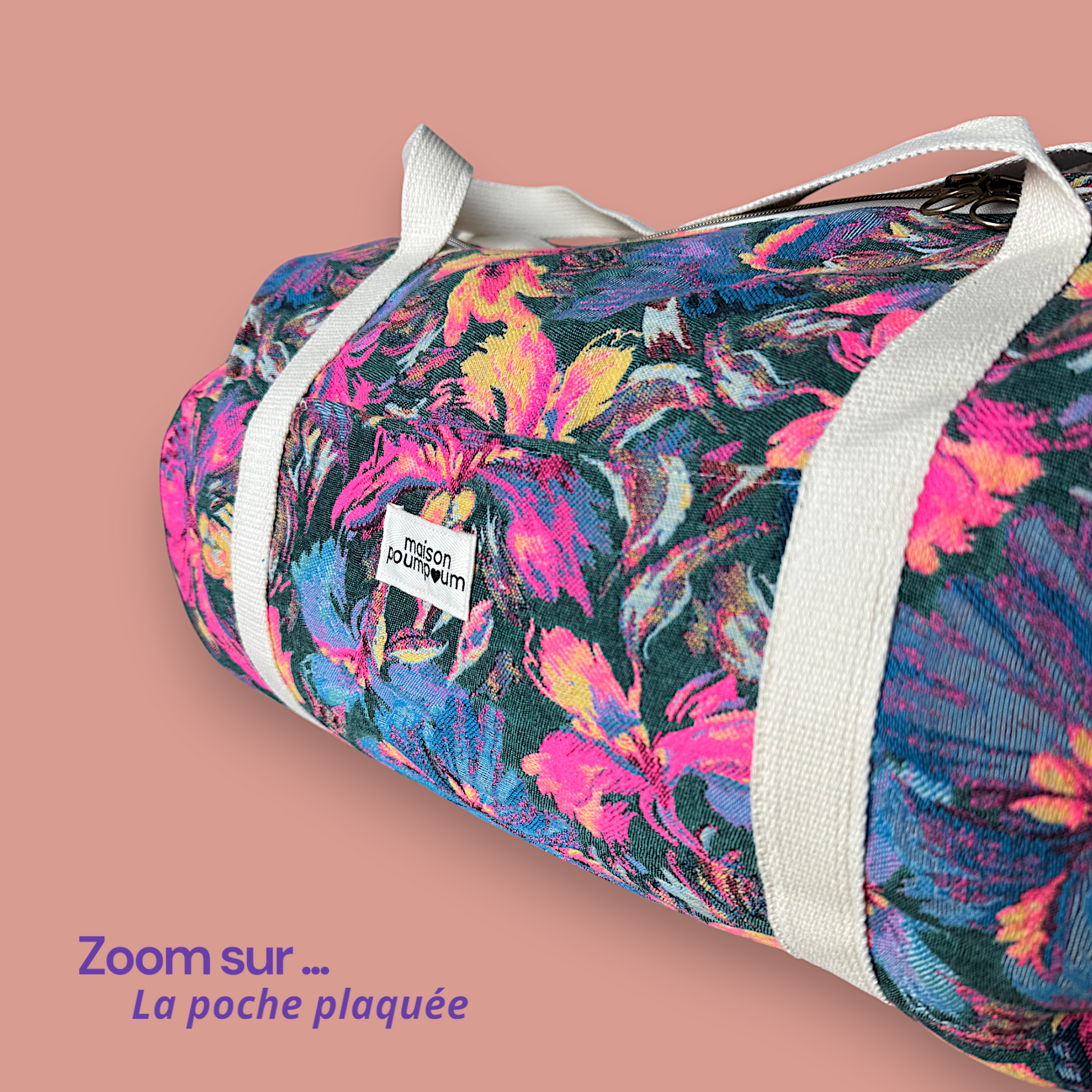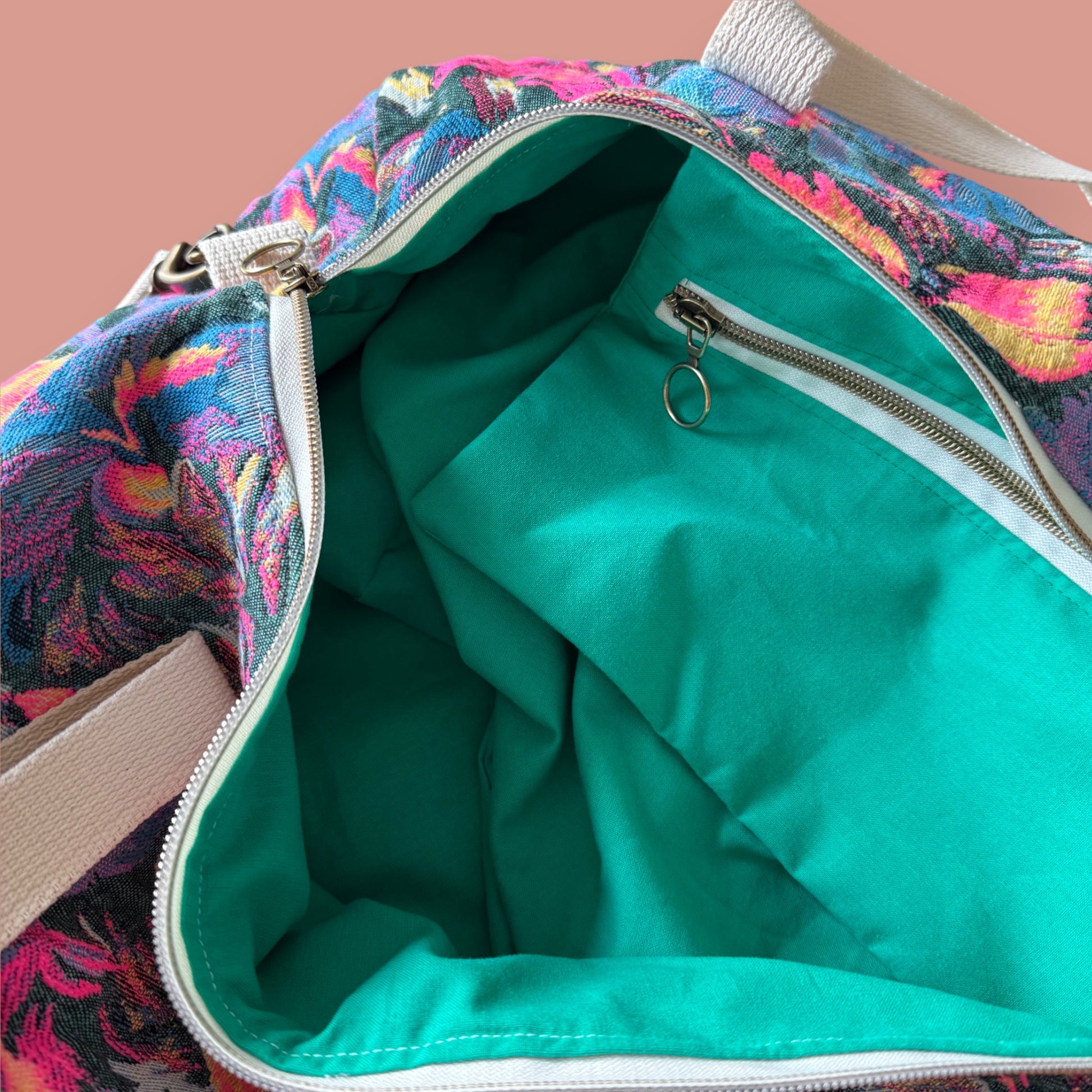 Ce sac week-end Maison PoumPoum, cousu dans un jacquard fleuri vintage aux couleurs vibrantes, est le compagnon idéal pour vos escapades de 2 à 3 jours — ou même un peu plus.