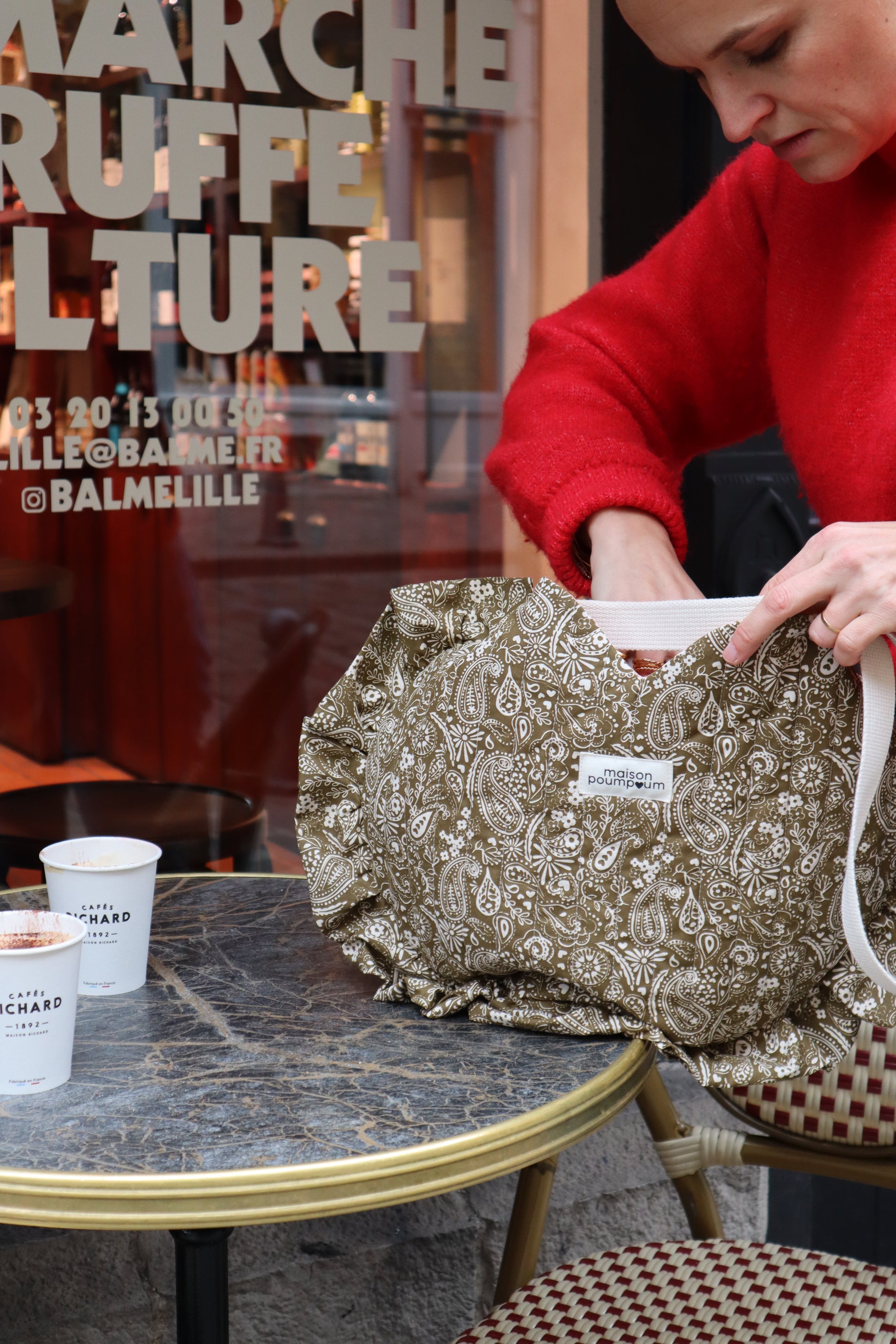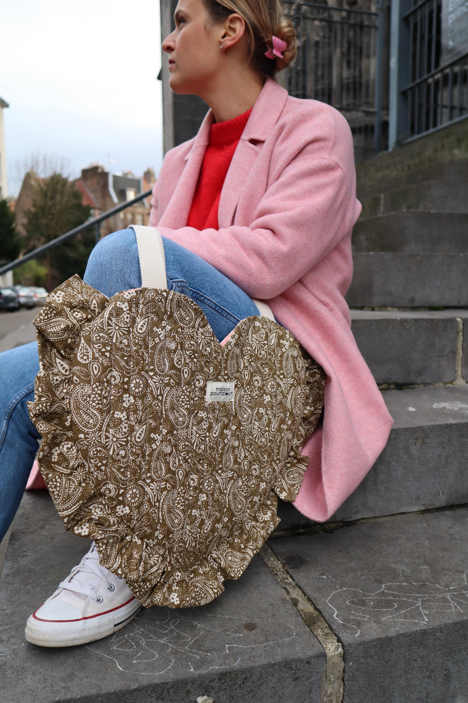 Tote bag cœur bandana kaki en édition limitée, fabriqué en France dans notre atelier. Ce sac au format cœur est entièrement doublé et souligné d’un froufrou pour une touche douce et féminine. Son imprimé bandana revisité en kaki en fait un accessoire tendance, idéal comme sac du quotidien ou comme idée cadeau originale pour la Saint-Valentin. Une pièce unique, produite en petite série.